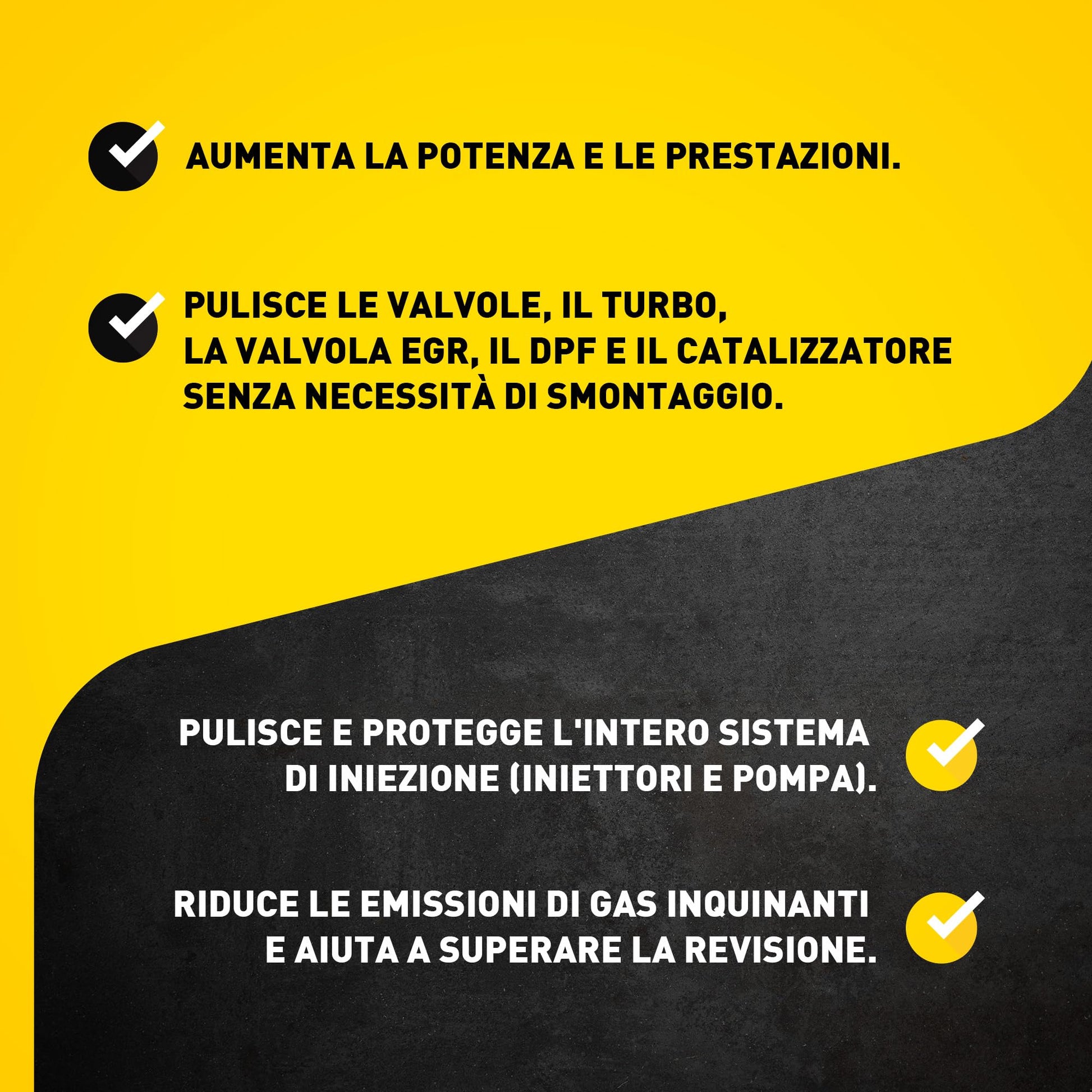 - Reinigt und schützt Einspritzdüsen, Kraftstoffpumpen, Ventile, Turbolader, AGR-Ventil, Dieselpartikelfilter und Katalysator ohne Demontage.