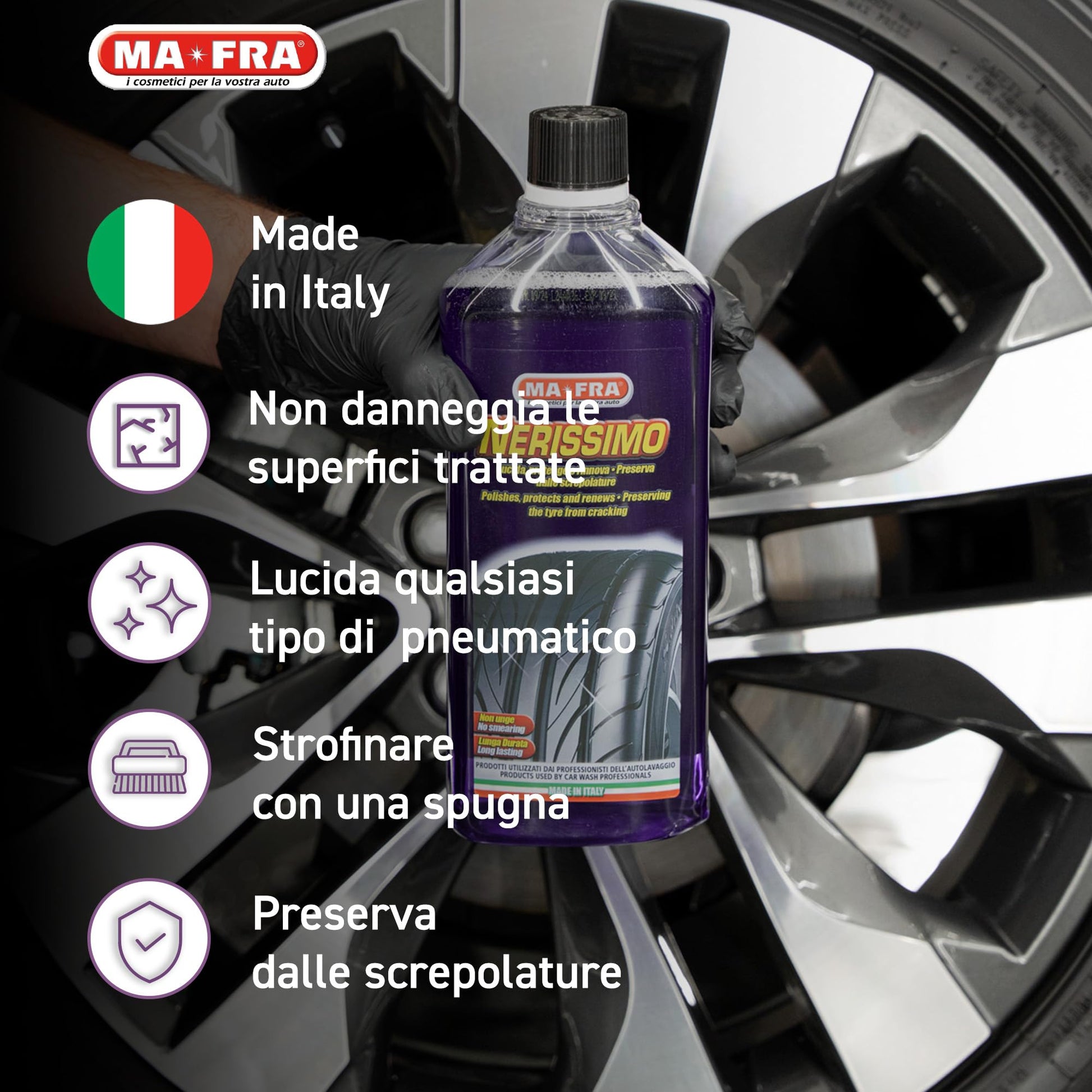 Ma-Fra Nerissimo is the perfect tire treatment for restoring, protecting, and enhancing the appearance of all types of tires without leaving grease or stickiness.