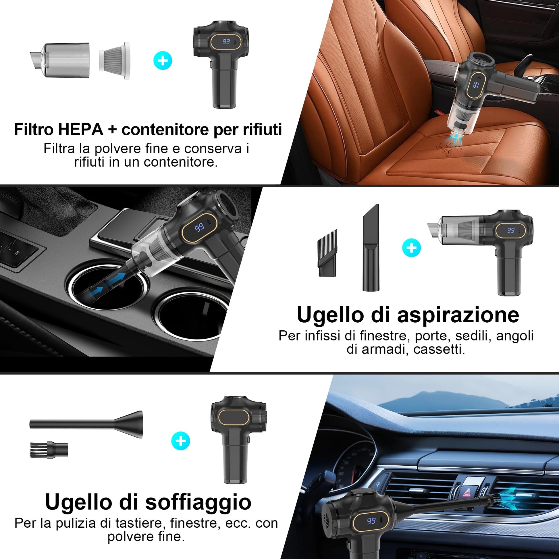 Mini Portable Car Vacuum Cleaner 15000Pa – Cordless, Rechargeable, HEPA Filter, 3-in-1 Vacuum, Inflate & Blow
